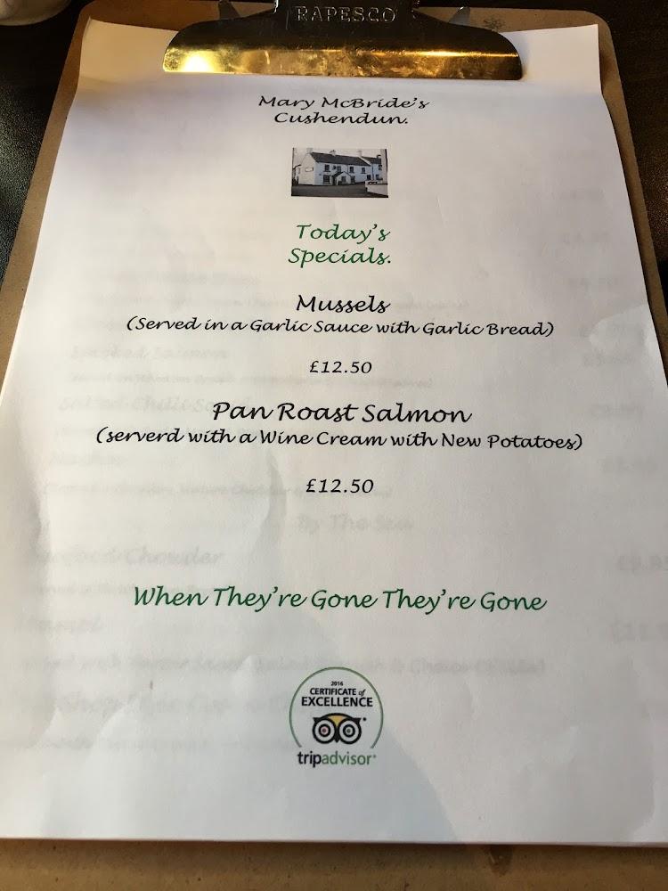 Cushendun itself is a picturesque village with historic charm, making Mary McBride's an integral part of the community. The pub brings together families, friends, and visitors who come to unwind and enjoy good food and drinks. The decor reflects its history with quirky touches, including memorabilia from the local Game of Thrones set, which adds a unique flair to the dining experience.